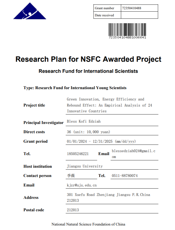 近日,国家自然科学基金委员会公布了2023年集中接收申请项目的评审结果,我院首次获批一项国家自然科学基金外国青年学者研究项目(资助直接经费36万)《绿色创新、能源效率和反弹效应》,项目负责人为我院加纳籍博士后Bless Kofi Edziah(博士后导师为孙华平教授)。绿色创新被认为是在不影响经济增长的情况下解决能源相关环境问题的最具经济效益的方法。该项目主要采用随机前沿分析等方法围绕绿色创新、能源效率和反弹效应的互动关系展开分析,并对提出的假说采用包括中国在内的数据进行实证检验。该研究对于我国提升能源效率促进双碳目标的实现具有重要的理论与实践价值。