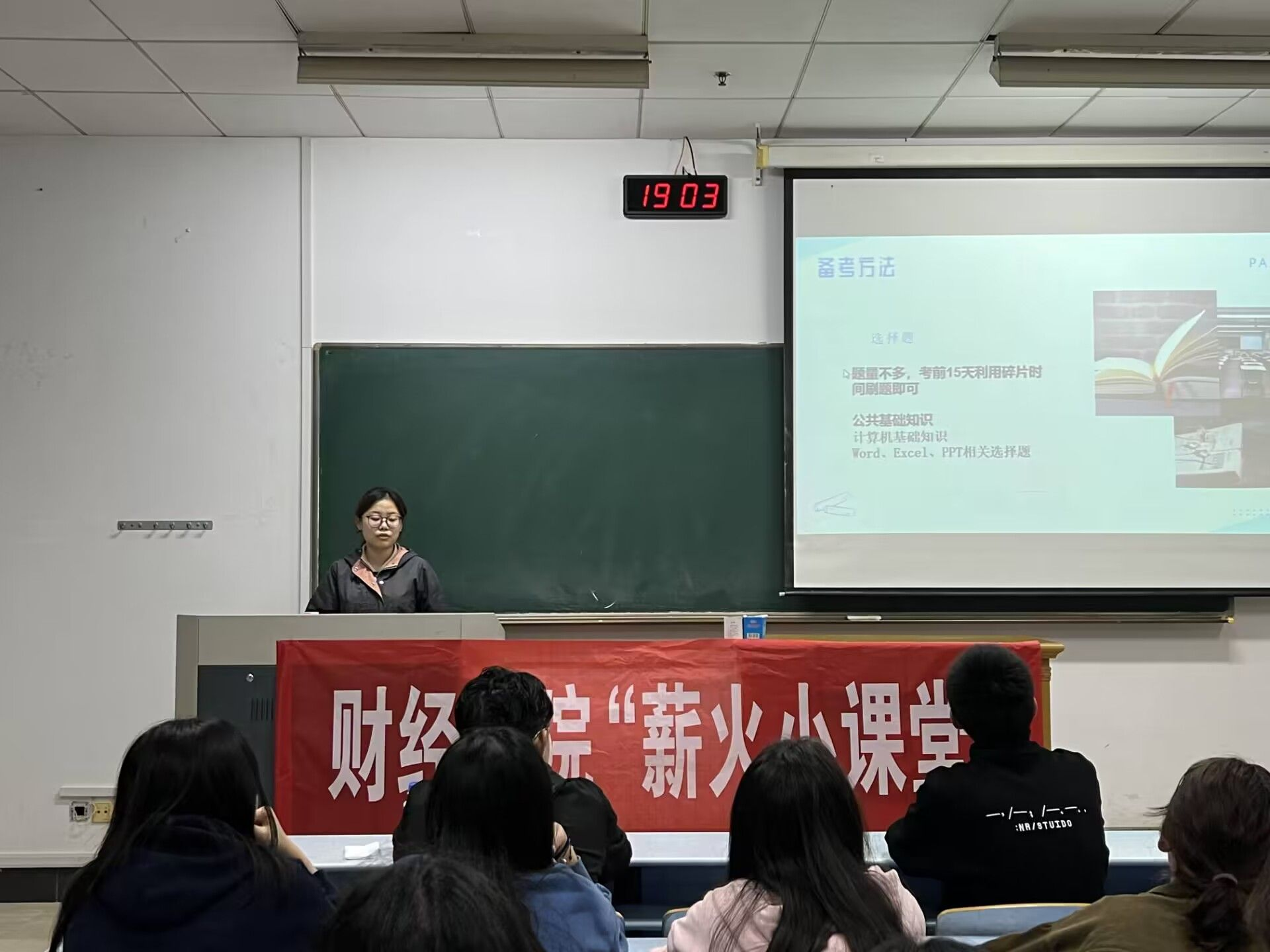 为帮助同学们提高计算机学习能力,调动学习积极性,4月14日,英国上市官网365在三江楼302教室举办“薪火小课堂”活动。本次活动由会计2203张芊荟担任讲师,为同学们讲解计算机学习的技巧,传授学习经验。