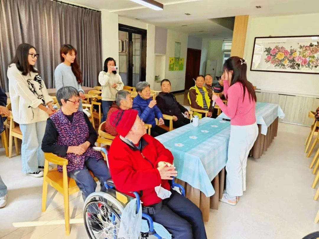 活动当天,沐家护理院的老师首先带领志愿者们参观了护理院的整体环境,详细介绍护理院的设施、服务以及日常运营情况,让志愿者们深切感受到了护理院温馨、舒适的生活氛围。随后,志愿者们与长者们共同参与一系列趣味横生的互动小游戏,如“猜五官”、“一杯到底”等,这些游戏不仅增进了长者之间的情感交流,还有效缓解了他们的孤独感。接着,活动进入音乐欣赏与唱歌环节。志愿者们精心挑选《南泥湾》《映山红》等经典老歌进行播放,并邀请长者们一同哼唱、点歌。在悠扬的歌声中,长者们仿佛回到了年轻时代,不仅舒缓了情绪,还锻炼了肺活量和记忆力。这一环节为老人们送去了无尽的温暖与欢乐。