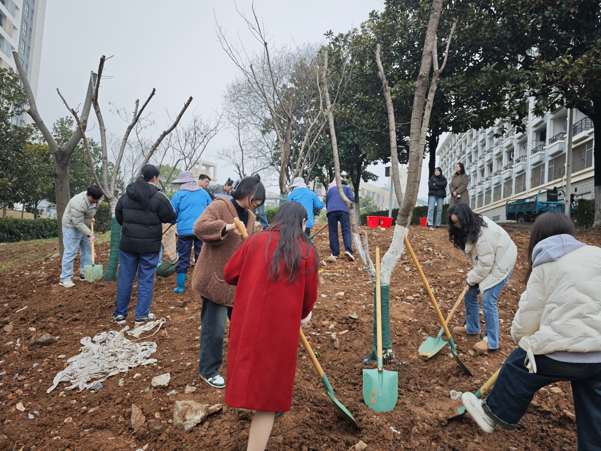 活动现场,大家四五人成组,挥锹铲土、扶苗填坑、踏土夯基、引水浇灌,每道工序细致严谨。大家一边学习栽种技巧,一边询问树种的生长特性,将理论知识与实践操作深度融合。春风拂过,汗水浸润的土壤与新栽的樱花树苗交织成生机勃勃的画卷。经过大家的默契配合,一棵棵新种的树苗迎风挺立,传递着春天的生机与活力。志愿者们不仅为生态环境增添新绿,也体验了一堂生动的环保课。