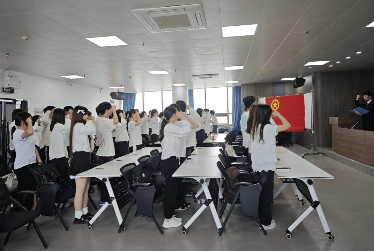 活动中,刘群东郑重宣读了新团员名单,为新团员颁发团员证并佩戴团徽,勉励他们牢记团员使命,勇担时代责任。接着,统计2401班倪航艺同学作为新团员代表发言,她结合自身成长经历,表达了加入共青团的光荣与责任,号召全体新团员坚定理想信念、勤奋学习,用实际行动践行入团誓言。随后,全体新团员面向团旗庄严宣誓,铿锵有力的誓言展现了财经学子坚定不移跟党走的决心。