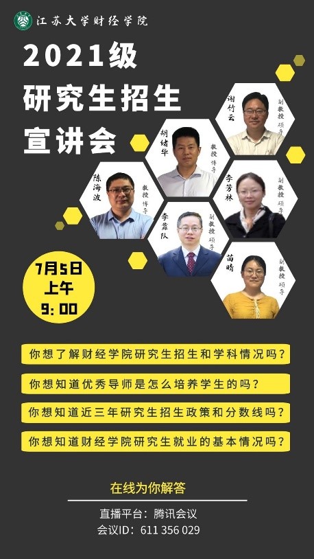 In order to increase the school's influence and popularity, and to further improve the quality of graduate students, on July 5, the School of Finance and Economics held the 2021 postgraduate enrollment online presentation through video conference for the first time. Professor Chen Haibo, deputy dean of the School of Finance, Professor Hu Xuhua, head of Applied Economics, Associate Professor Miao Qing, dean of the Department of Accounting, Associate Professor Xie Zhuyun, dean of the MPAcc Center, Associate Professor Li Fanglin, dean of the Department of Statistics, and Associate Professor Li Kaoque, deputy dean of the Department of Financial Management, gave lectures on the general situation of the school, subject development, postgraduate training, employment prospects, and research and recruitment policies. The presentation attracted more than 100 students from universities including Shanghai University of Science and Technology, Anhui University of Finance and Economics, Shanxi University of Finance and Economics, University of Jinan, Fujian Normal University, China West Normal University, Jiangsu University and other universities. The graduate secretary, Ms. Chen Yan, answered the relevant policy questions that the candidates were concerned about.
