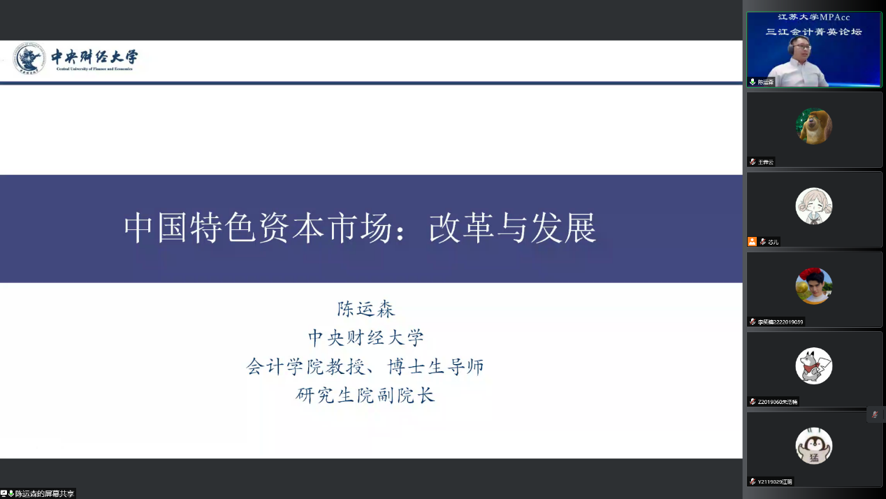 5月20日,中央财经大学研究生院副院长陈运森教授做客英国365公司三江会计菁英论坛,为我校MPAcc学生作了主题为“中国特色资本市场:改革与发展”的报告。论坛由英国365公司副校长张济建教授主持,二百余名师生通过腾讯会议参加了此次讲座。