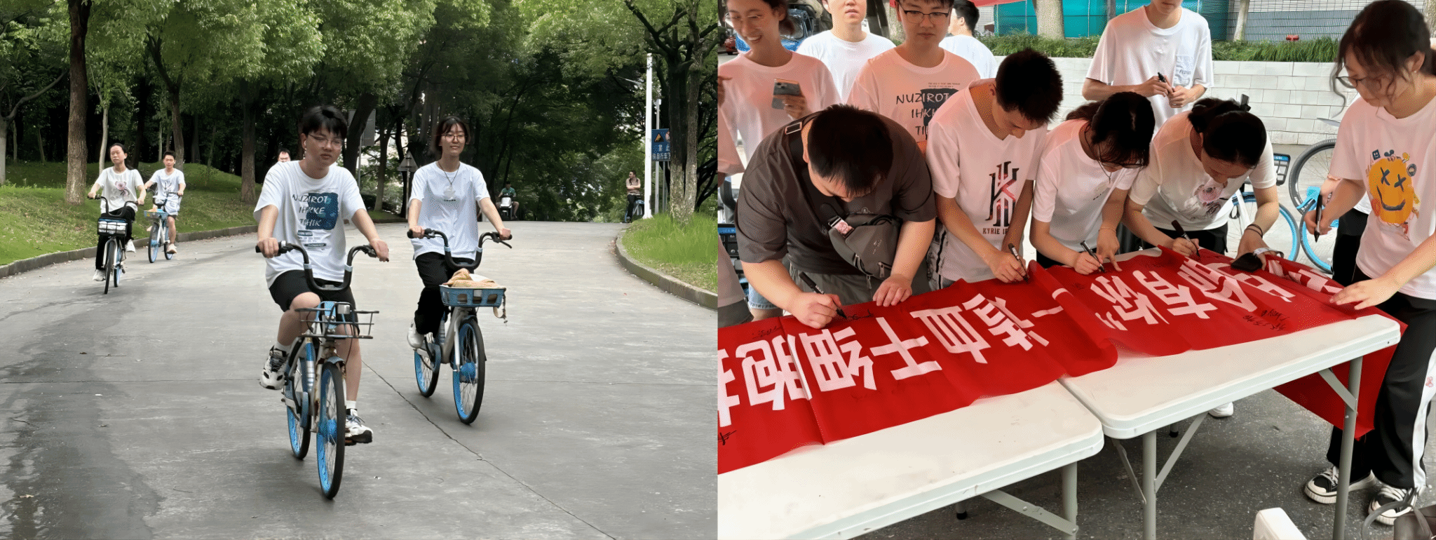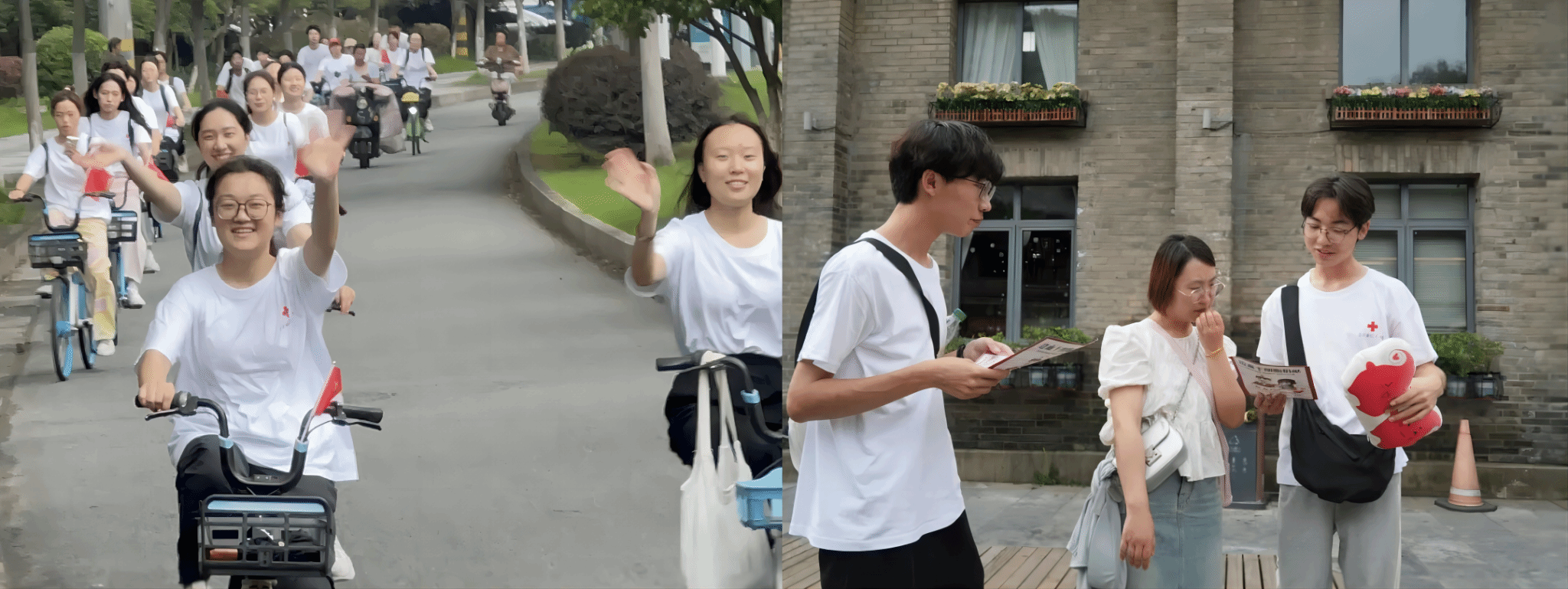 活动中,志愿者团队分成校内校外两条路线,校内志愿者围绕勤人谷进行骑行,并在校内新一区处通过征集签名的方式进行宣传。校外志愿者团队则前往西津渡,向过往行人发放宣传单介绍造血干细胞相关知识。