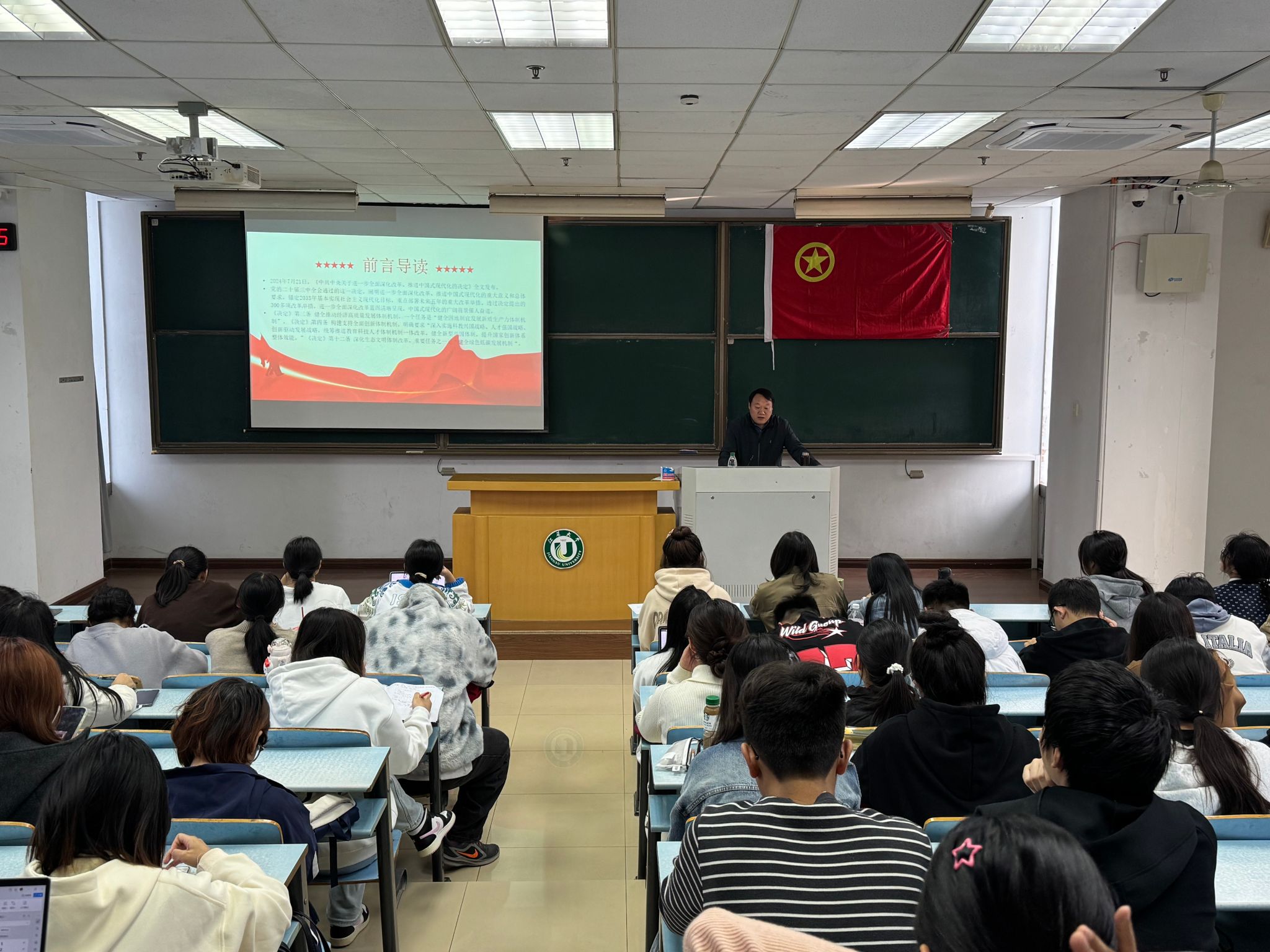 王为东围绕“低碳技术创新与新质生产力发展”的主题,结合党的二十届三中全会精神,全面而深入地阐述了低碳技术的重要性及其对新质生产力发展的推动作用。他从党的二十届三中全会精神概述出发,详细解读了全面深化改革、推进中国式现代化的重大意义,并指出生态文明体制改革是总体改革事业的重要组成部分。王为东强调,推动低碳技术创新已成为绿色低碳发展的重要手段之一。他通过丰富的数据和案例,展示了中国在新能源汽车、光伏、风电等绿色低碳制造前沿领域的迅猛发展,以及中国创造在低碳技术专利申请量上的显著增长。同时,他还提到了《联合国气候变化框架公约》第二十八次缔约方大会达成的《阿联酋共识》,强调了中国在参与全球气候治理中的积极作用和自主贡献目标。在讲座的互动环节,研究生们积极提问,与王为东就低碳技术创新、新质生产力发展等话题展开了深入探讨。王教授耐心解答,不仅为同学们解决了困惑,还激发了他们对相关领域研究的兴趣和热情。