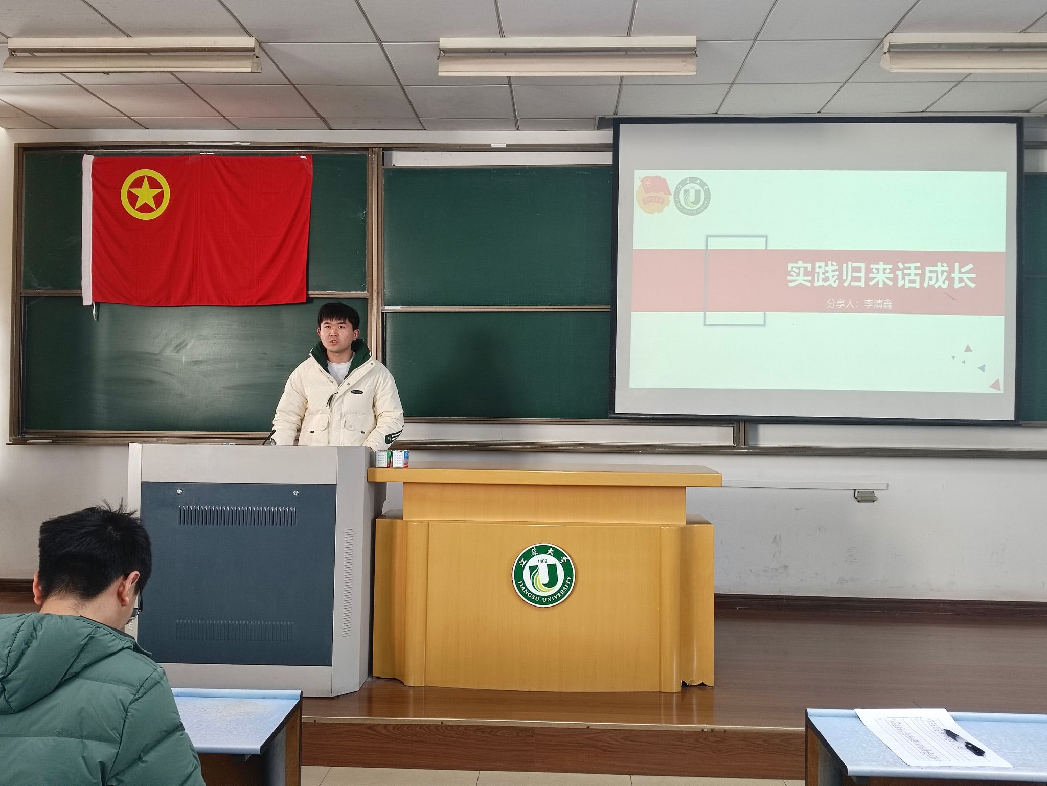 李清鑫则从“筹备”、“实践”、“感悟”三个维度,向同学们分享他的社会实践心得。在筹备阶段,他详细阐述了社会实践的组织流程、参与方式以及可能遇到的挑战和应对策略,并分享了如何有效获取资源、制定详细计划以及应对突发情况的经验,为同学们提供了实用的筹备指南。李清鑫分享了暑期社会实践优秀视频,带领同学们身临其境地感受了青年学子用双脚丈量大地、用爱心传递温暖的豪情。他特别提到,作为“青春献力,翱翔小岗”社会实践团队的一员,他亲身感受到了中国农村改革的巨大成就。在那里,他们看到了青年学子在乡村振兴中的担当与作为,也感受到了乡村因青年人的参与而焕发出的勃勃生机与活力。李清鑫鼓励同学们积极投身社会实践,用实际行动践行青春誓言。他提到,社会实践是青年学子成长成才的重要途径,也是实现个人价值和社会价值的重要方式。只有深入基层、深入群众,才能更加深刻地了解社会、认识国情,才能更好地为社会发展贡献自己的力量。