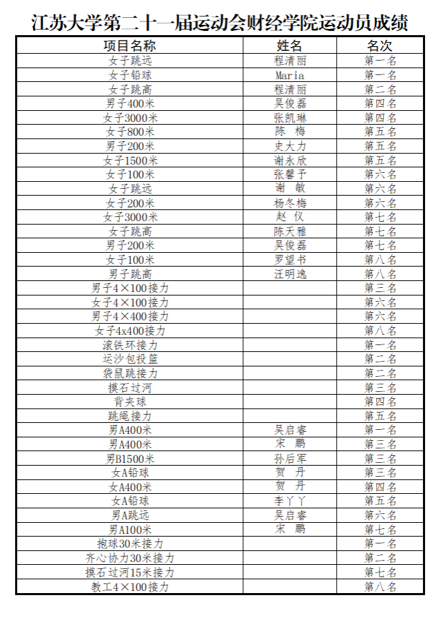 运动会上,运动健儿们奋力拼搏,勇往直前。在田径项目中,我院获五枚金牌,四枚银牌,五枚铜牌,多个项目跻身前八,实现重大突破。趣味项目中,参赛队员们再创佳绩,斩获滚铁环接力、抱球30米接力第一名,运沙包投篮、袋鼠跳第二名、齐心协力30米接力第二名,摸石过河第三名,背夹球接力第四名,双人跳绳接力第五名!