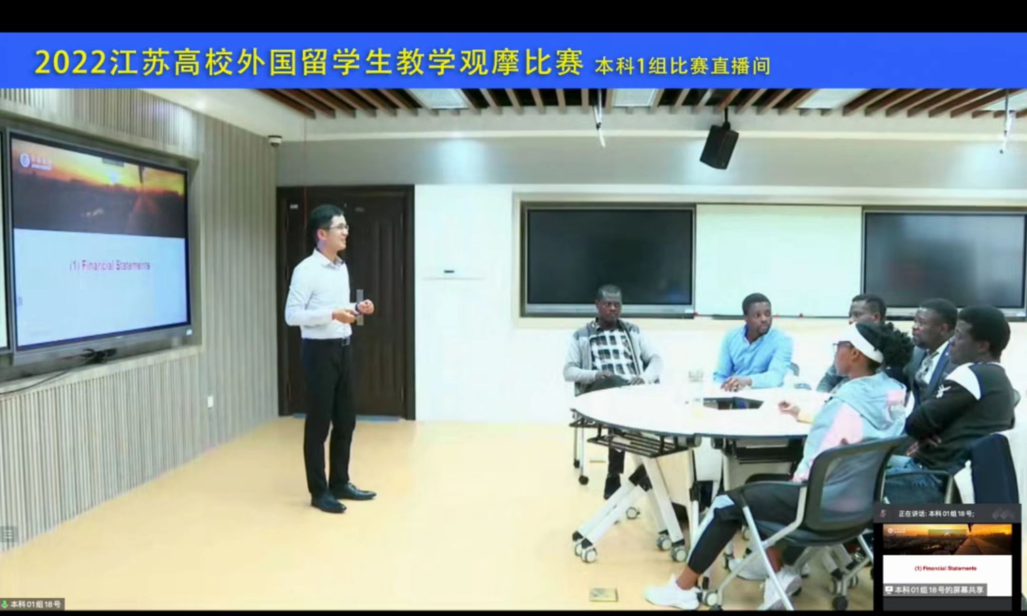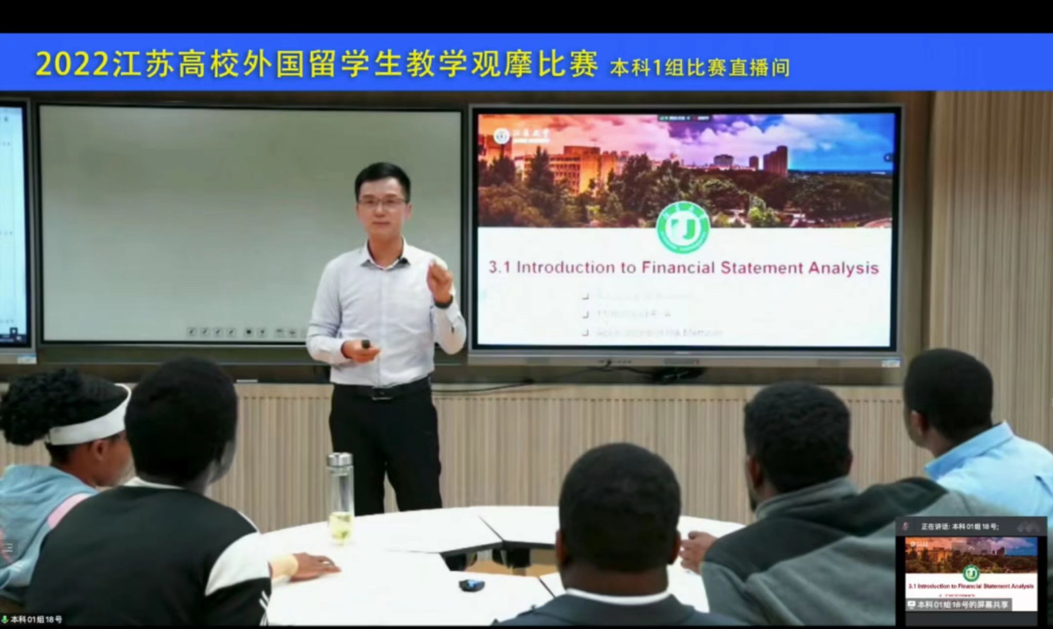 为了深入贯彻落实《教育部等八部门关于加快和扩大新时代教育对外开放的意见》和《江苏省“十四五”教育发展规划》,积极推进“留学江苏”行动计划,持续提升来华留学生培养质量,在江苏省教育厅指导下,江苏省高等教育学会外国留学生教育管理研究委员会主办了江苏高校外国留学生教学观摩比赛。比赛以直播的形式在线上举行,经过高校推荐、初赛,全省共有41所高校79门课程入围最终决赛。面对激烈竞争,顾水彬老师认真备赛,多次请教学院同事,反复打磨教案,认真设计教学安排,并重点嵌入了中国思政元素与现代信息技术,取得了良好效果。