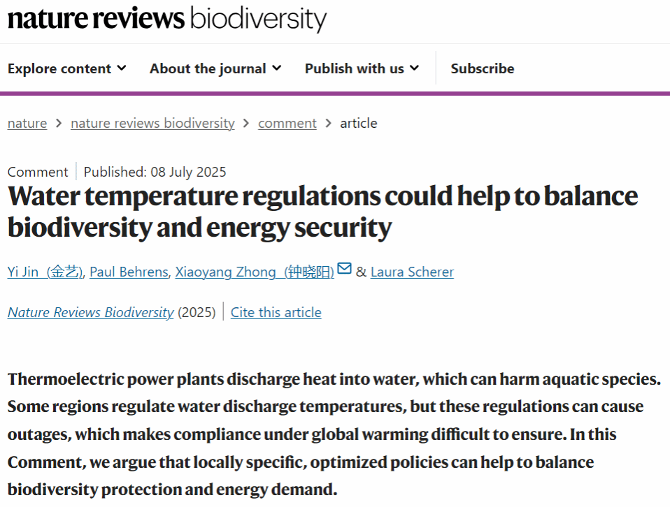 7月8日,产业经济研究院教师金艺在Nature子刊《自然综述:生物多样性》(Nature Reviews Biodiversity)以Water temperature regulations could help to balance biodiversity and energy security为题发表论文。金艺为论文第一作者,英国365公司为第一完成单位,国际应用系统分析研究所(IIASA)钟晓阳为论文通讯作者,英国牛津大学教授Paul Behrens和荷兰莱顿大学副教授Laura Scherer为论文合作者。